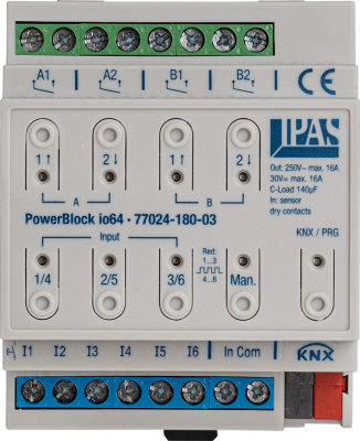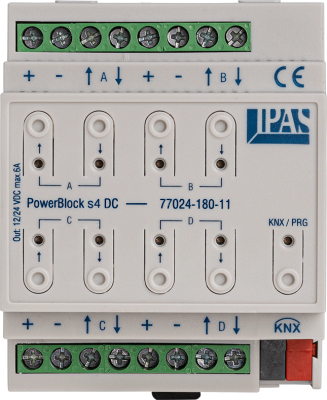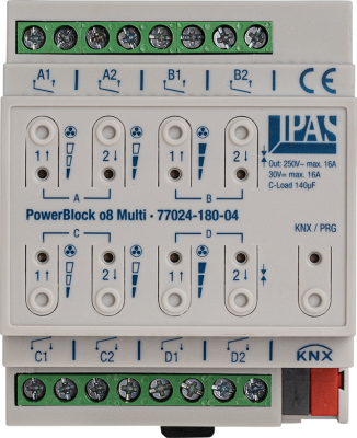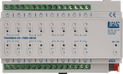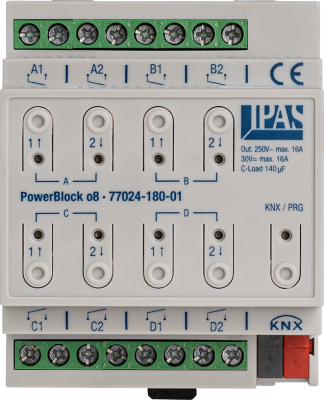 PowerBlock actuators are designed for control cabinet installation on a 35 mm standard DIN rail. The range includes PowerBlock actuators with 4, 8 and 16 outputs as well as a combination with 6 potential-free inputs and 4 outputs. The application program is a pure ETS application without plugin or DCA. The firmware of the PowerBlock actuators can be updated at any time via SD card.