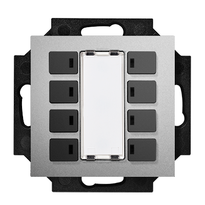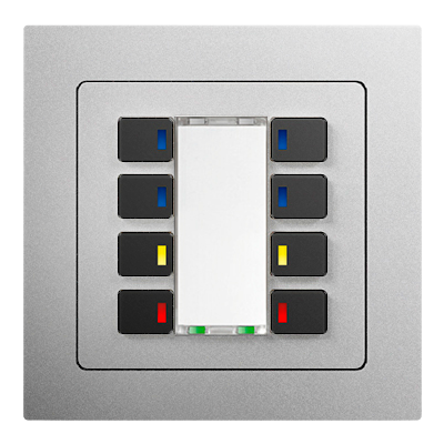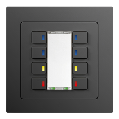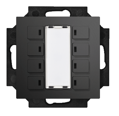 Piazza 8 RGB complements the basic device with RGB status LEDs in the button elements. For typical KNX operating functions such as switching or dimming, the status of the KNX object can thus be displayed in the button feedback. The labeling field can be used for the description of the button function and has 2 orientation RGB LEDs at the top and bottom.