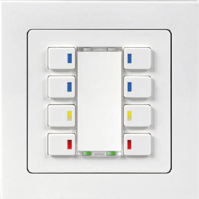 Piazza 8 RGB devices support the functions switching, dimming, value setting, step-by-step value setting, blinds, scene control, setpoint shift, operating mode setting, presence, fan control, individual buttons (on, off, toggle).